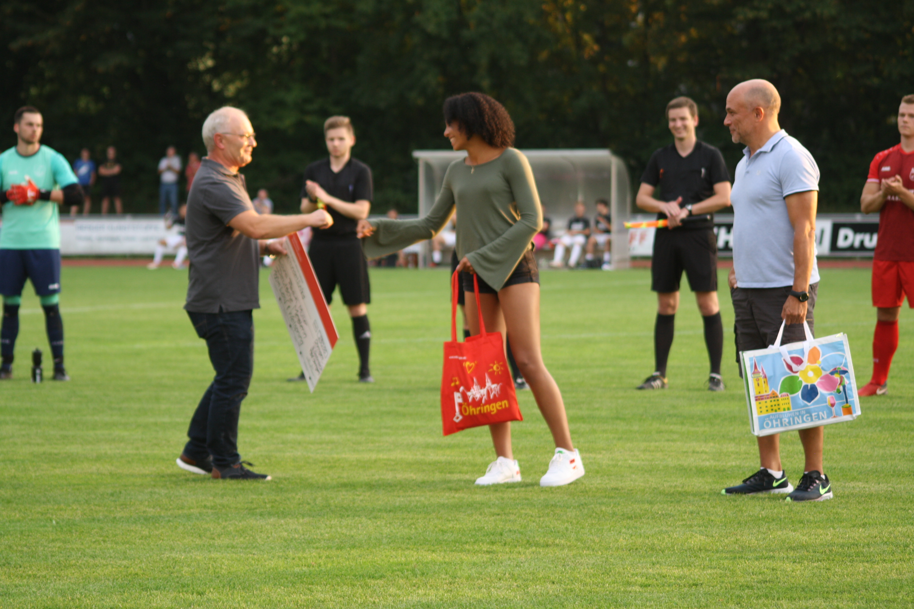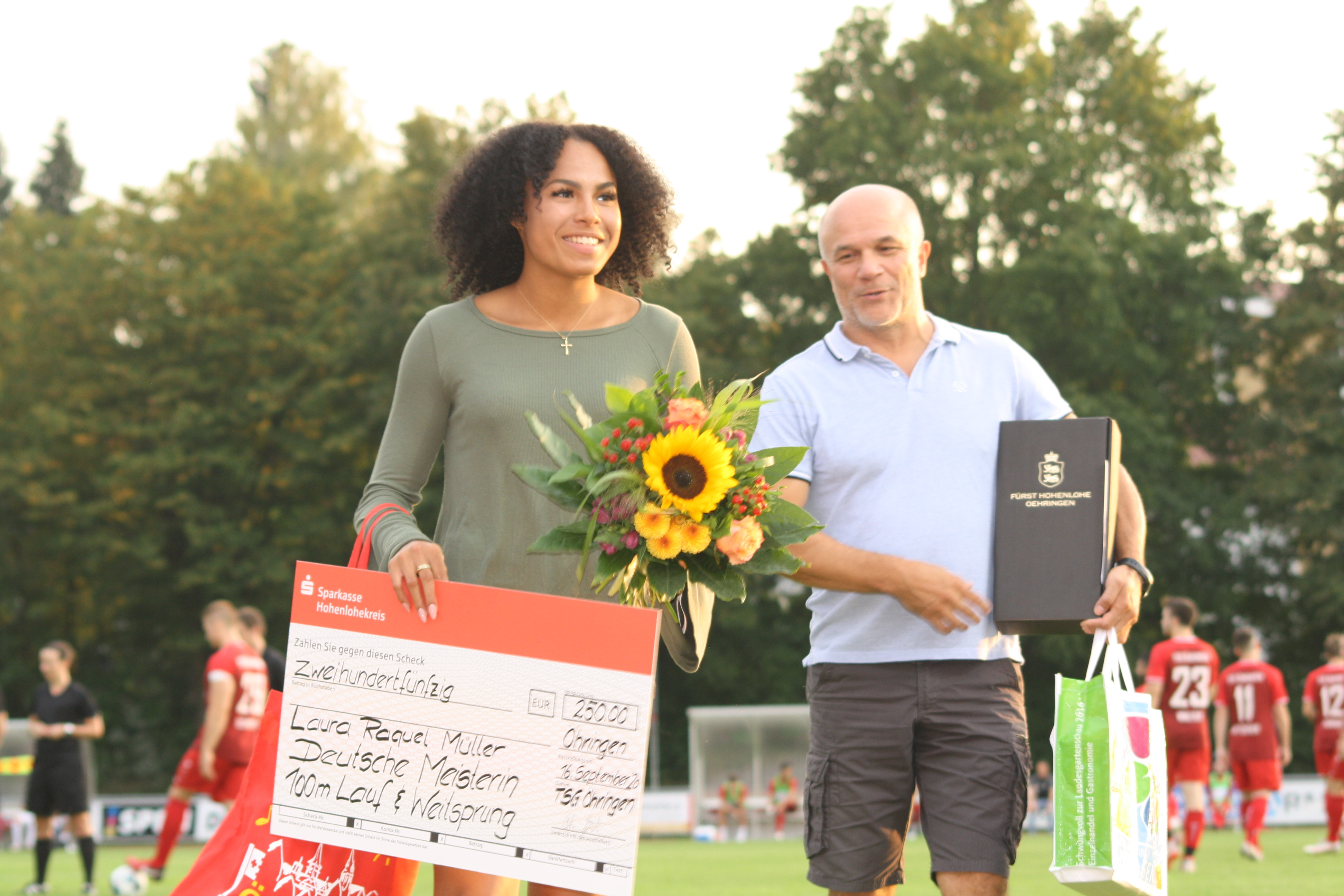 Die Stadt Öhringen, in Person von Oberbürgermeister Thilo Michler, und die TSG Öhringen ehrten sie und ihren erfolgreichen Trainer + Vater mit Schecks und Präsenten.