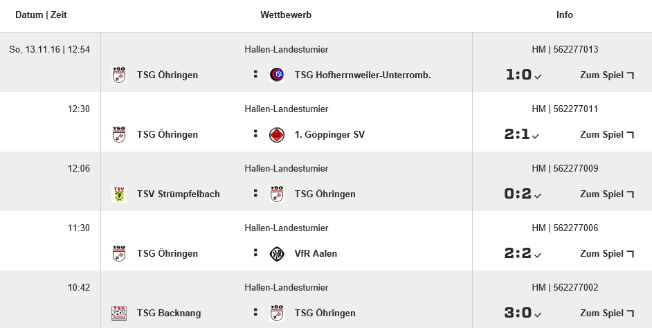 Am Sonntag, 13.11.2016 trafen in der Lindachsporthalle in Weilheim/Teck in der Vorrundengruppe 3 die Teams der TSG Öhringen, TSG Backnang, TSG Hofherrnweiler, VfR Aalen, TSV Strümpfelbach und des 1. Göppinger SV aufeinander, um den Qualifikanten für das Landesfinale in Ellwangen aus zu spielen. Nach der Auftaktniederlage gegen die TSG Backnang (0:3) folgte ein 2:2 gegen den VfR Aalen sowie Siege gegen den TSV Strümpfelbach (2:0), dem 1. Göppinger SV (2:1) und der TSG Hofherrnweiler (1:0). Am Ende belegten die D-Junioren der TSG Öhringen mit 10 Punkten und 7:6 Toren, hinter der TSG Backnang (12 Punkte, 12:2 Tore), den 2. Platz in ihrer Vorrundengruppe und verpasste nur knapp den Einzug in das Landesfinale. Trotzdem herzlichen Glückwunsch zu der tollen Leistung!