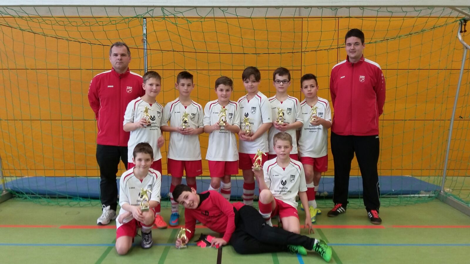BWK-Cup in Ilshofen am 28.02.2016: Für die Jungs war dieses Turnier das letzte Hallturnier als E-Junioren Spieler. Dementsprechend motiviert und konzertiert wurde Spiel für Spiel angegangen. Bereits in der Gruppenphase zeigten die Jungs, dass sie diesen Tag erfolgreich gestalten wollen. Man spielte sich souverän bis ins Finale vor. Im Finale traf man, wie auch bereits in der Gruppenphase, auf den TSV Obersontheim. Nach einem packenden Finale mit Chancen auf beiden Seiten, konnte man sich mit 3:2 durchsetzen und beendete das letzte Hallenturnier als E-Junioren-Spieler verdientermaßen mit dem Turniersieg.