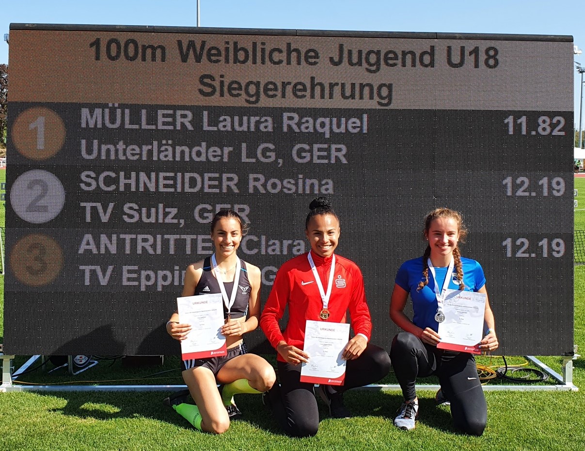Laura Raquel Müller sicherte sich bei den BW U18 in Walldorf zwei Titel. Im 100meter Lauf in 11,82sekunden und im Weitsprung mit neuer persönlicher Bestleistung von 6,26meter. Dies bedeutete auch die Einstellung des Frankenrekordes von Anna Bühler Unterländer LG / TG Forchtenberg aus dem Jahre 2014!