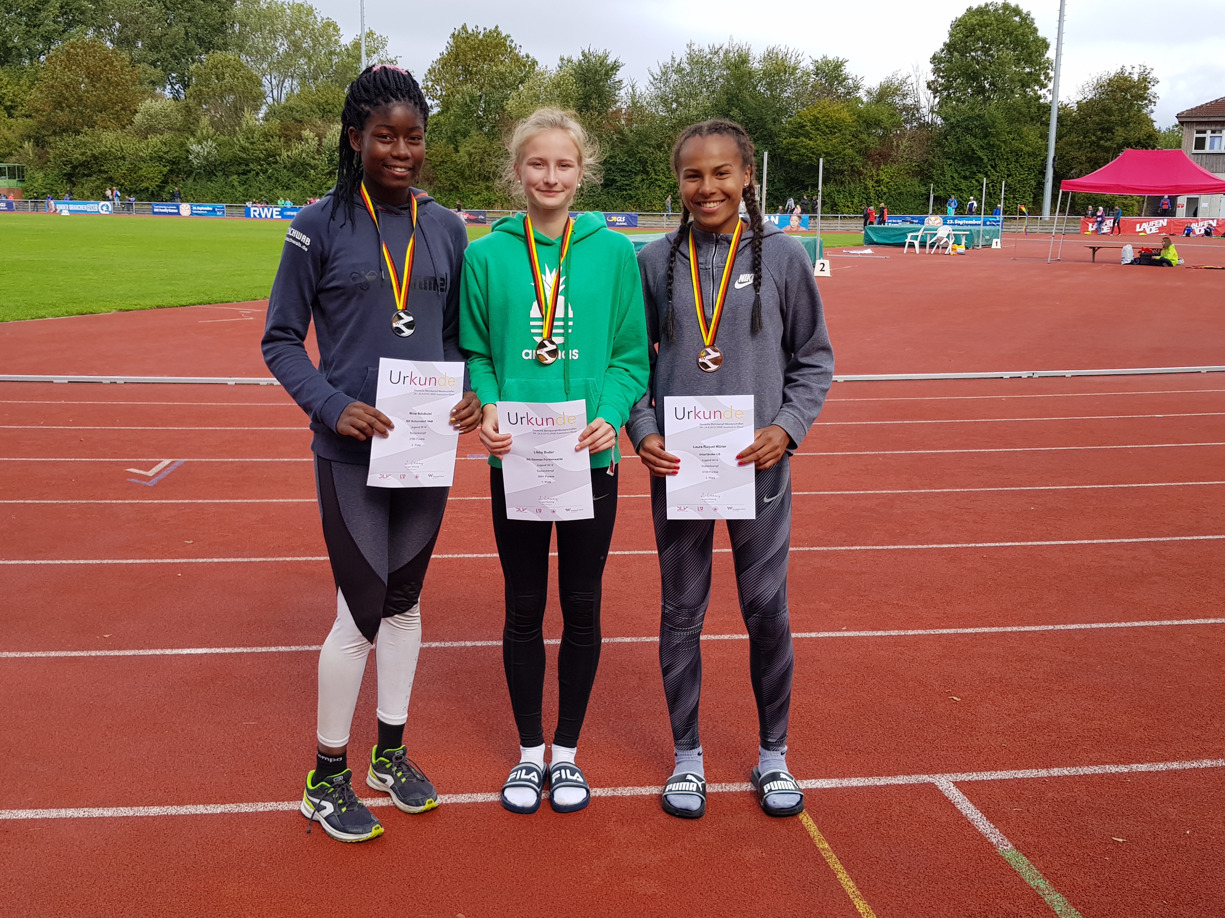 Laura Raquel Müller (ULG/TSG Öhringen), startete in der Altersklasse W14 im Siebenkampf. Am ersten Tag nach 80m Hürden in 12,06sek (neuer Frankenrekord), Hochsprung 1,58m, Kugelstoßen mit 11,37m und dem 100m Lauf in 12,42sek, lag Laura überraschend in Führung. Am zweiten Tag galt es die Führung zu verteidigen. Leider lief es bei ihrer Paradedisziplin, dem Weitsprung nicht rund und so gingen nur 5,16m in die Wertung ein. Auch der Speerwurf mit 30,20m lag 3m unter Bestleistung. Im abschließenden 800m Lauf galt es einen Podestplatz zu sichern. Mit neuer Bestleitung in 2:54,48min erkämpfte sich Laura zum Abschluß, mit neuem Frankenrekord von 3.748 Punkte, die Bronzemedaille.
