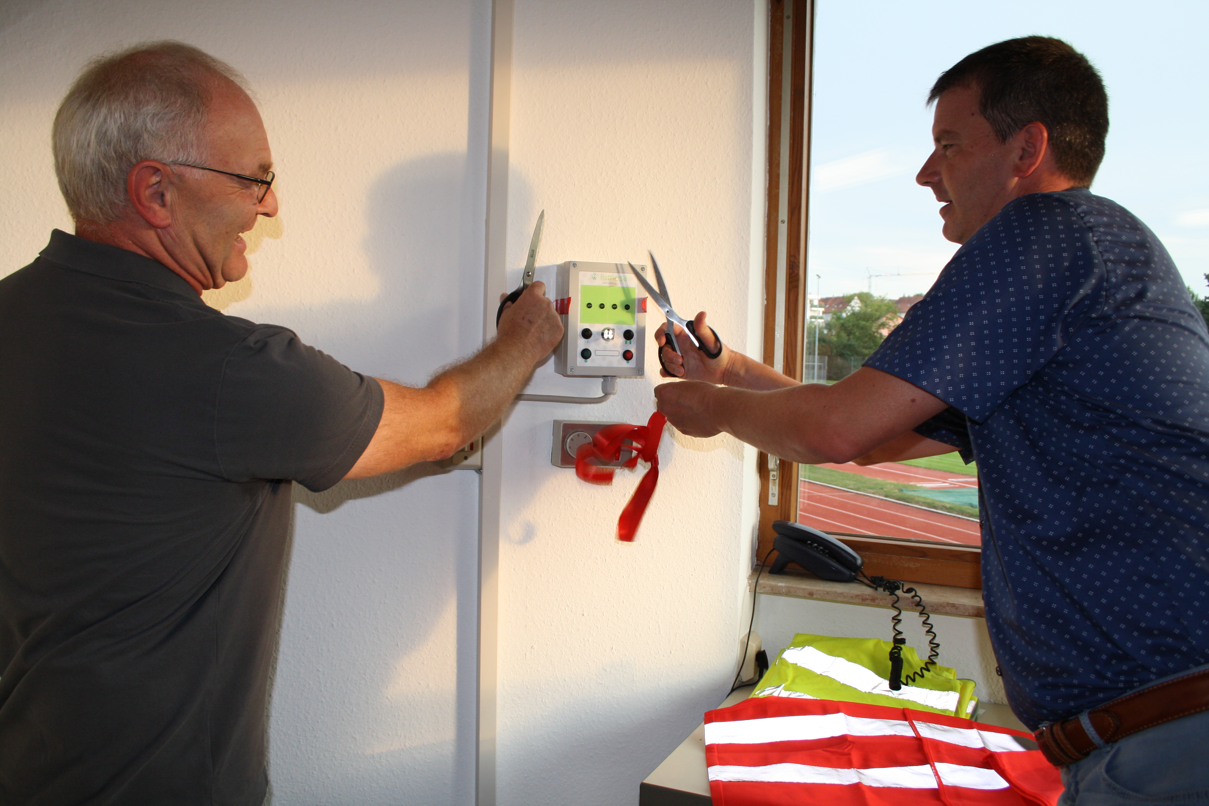 Im kleinen Kreis wurde das rote Band zerschnitten und die verschiedenen Möglichkeiten der Flutlichtanlage, welche eine Gesamtleistung vom 200 Lux hat, getestet.