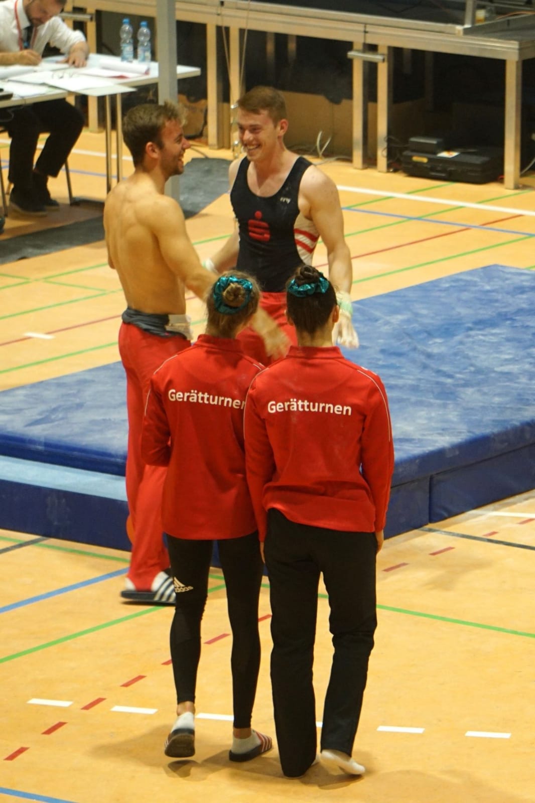 Bevor die Party am Samstagabend, zumindest für den Großteil der Gruppe, losgehen konnte, zeigten Celine Möhrle, Emily Grund, Micha Schmidt und Ron Philippiak beim 4inMotion, dass sie auch auf Zeit gut turnen können. Sie bewältigten den Parcours aus Bodenturnen, Schwebebalken, Parallelbarren und Sprungtisch in nur 42 sec.